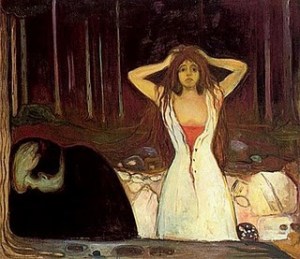 Edvard Munch was a Symbolist painter, a printmaker, and a forerunner of expressionistic art. I chose him becuase of the fear he instills in his art. My project focuses on unknown fear which then leads to other things such as anxiety. All of his paintings have so much emotion in them. I had the pleasure of seeing his work in NY at MOMA a few years ago. Everyone is familiar with his famous painting, The Scream, which envokes fear and the unknown. Although I love The Scream, I chose two other pieces of his artwork to talk about. The first one is called Ashes. It pictures a woman who looks extremely frantic. There is some chaos around her as something has just happened. She is in the middle of what seems to be a forest and it also appears to be nighttime. Just each of these aspects by themselves are fearful to me. You don’t know what will happen next or what may be in front of her. I know a million thoughts would be running through mt head like how am I going to get out of here?, is there anything/anyone else out here?, am I going to live?, and so on. My stage project focuses on the unknown and Munch creates a perfect example of the unknown here. She doesn’t know what will happen next….