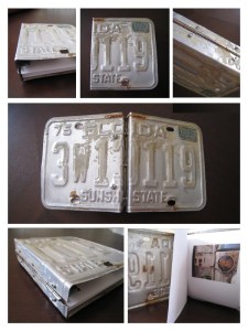 After figuring out the construction of the actual book itself, I slightly re-worked my idea again. I decided to only use one license plate instead of two as I liked the look of it better, which resulted in a smaller book. I had to scrap (ha ha) the diptych idea for now, but I plan on doing that at a later date. The inside of the book contains 33 photographs and the license plate was from one of the cars photographed in the book.