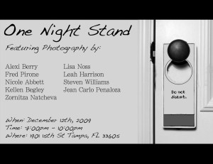 One Night Stand, is this Saturday night from 7-10 at Gallery Live in Ybor City. Please come out and support me and check out some of my work and work from the Special Topics Photography class ! Hope to see you there!!